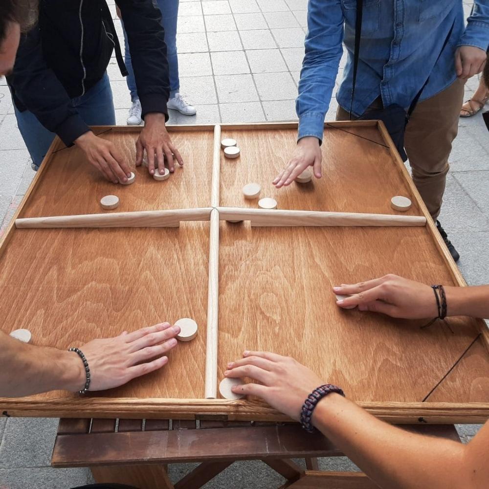 This wooden countertop game will provide you with hours of fun. The principle is simple: the first player to get rid of all his pucks wins the game. To do this, each player uses the rubber band to send the pucks into the central trapdoor. A handcrafted wooden toy that demands speed, agility and self-control.